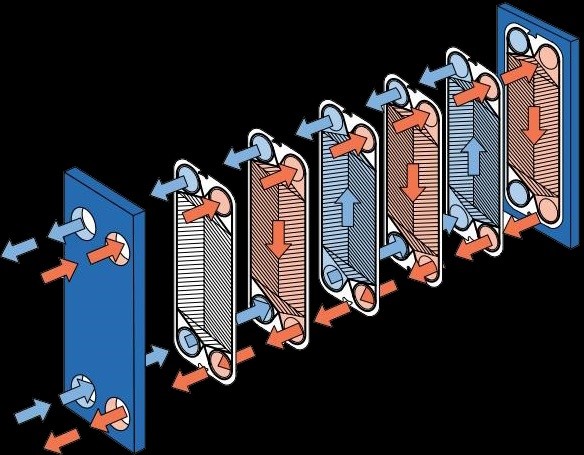 2-ساختار اواپراتور صفحه‌ای به گونه­ای است که مجموعه‌ای از صفحات شیاردار روی هم قرار گرفته و از طریق واشرهایی هوابندی می‌شوند. اتصال این صفحات به یکدیگر به گونه­ای است که مبرد بین دو صفحه جریان یافته و سیال سرد شونده بین جفت صفحات مجاور در جریان است در این نوع اواپراتور- دو سیال بدون برقراری تماس فیزیکی و اختلاط با یکدیگر، در فاصله ایجاد شده بین صفحات با الگوی زوج و فرد جریان یافته و از جداره صفحات با یکدیگر تبادل حرارت دارند . این نوع اواپراتوره ساختاری فشرده دارد که امکان جاسازی آنها در فضاهای کوچک را فراهم می­سازد.
